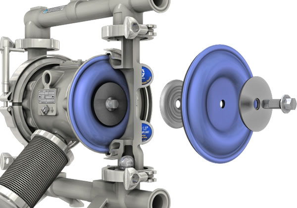 在卫生领域应用中,被泵送的介质通常都含有悬浮的小颗粒。在这种情况下,许多用户都会选用PTFE/EPDM一体式膜片,其接触物料一侧的材质是聚四氟乙烯(PTFE),接触压缩空气一侧的材质是三元乙丙橡胶(EPDM)。一体式膜片可阻止任何介质渗入膜片压板背面,从而不会滋生细菌。